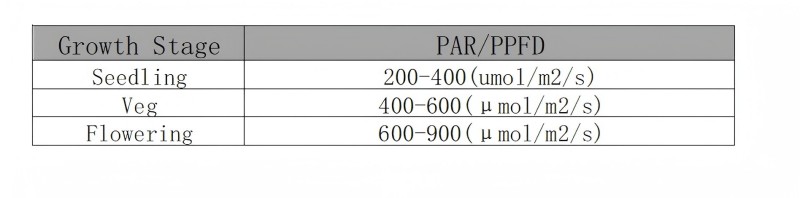 Ο παρακάτω πίνακας παρέχει το βέλτιστο εύρος PAR για κάθε στάδιο του κύκλου ανάπτυξης των φυτών: